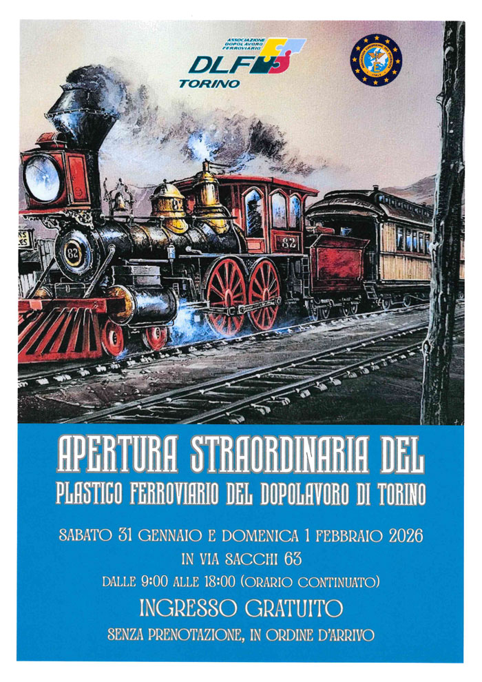 Lo spettacolare plastico di treni in miniatura del DLF Torino, in via Sacchi 63, sarà di nuovo aperto al pubblico nei giorni 31 gennaio e 1 febbraio 2026, dalle ore 9 alle 18, con orario continuato e ingresso gratuito, senza prenotazione, in ordine di arrivo.